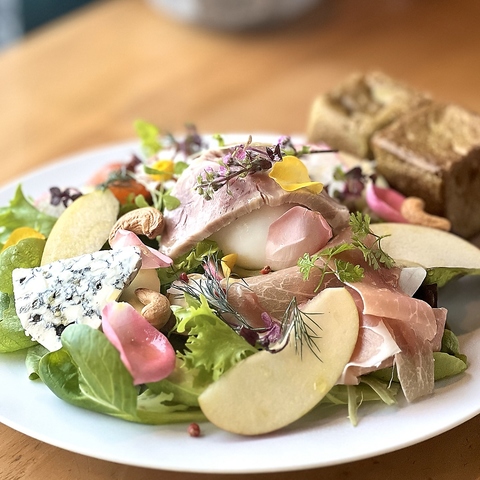 肉、魚、チーズ、フルーツ、野菜の豪華主菜サラダ。通称美食家のサラダです。国産豚ロースハム、フランス産生ハム、静岡サーモンマリネ、しもきた半熟卵、ブルーチーズ、林檎などなど盛りだくさんです。