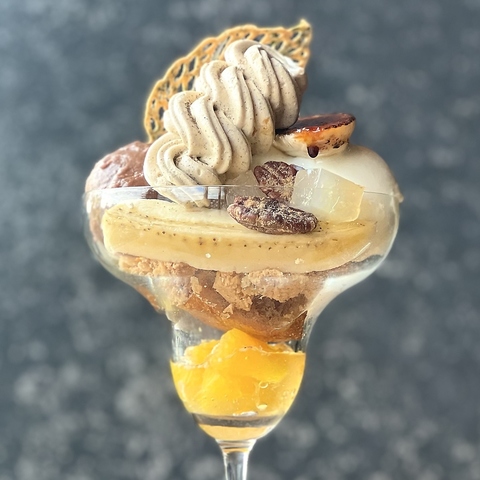 濃厚なコクと甘みのある高級エクアドルバナナをふんだんに使用。ふんわりと仕上げた軽やかな生地感。マスカルポーネクレームシャンティ、特製ジャムでどうぞ。