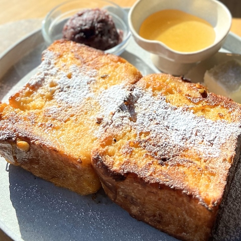 国産小麦はるゆたかでつくる生食パン。濃厚なコクのあるしもきた卵とたっぷりのクリームアパレイユを丁寧に浸して仕込んだ、贅沢なフレンチトースト。発酵バターで香り高く焼きあげます。