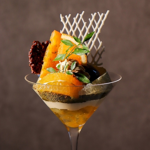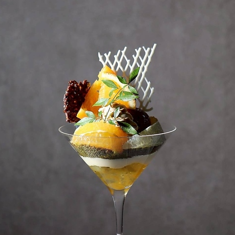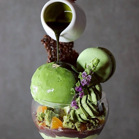パフェに使うパーツは店内ですべて手作りしております。季節に合わせてコンセプトを設定してどの角度から見ても美しい仕上がりになっております。贅沢パフェ、上から見るか?横から見るか?一日の終わりに、頑張った自分へご褒美を。 優越感と背徳感をちょっぴり感じながら召し上がって頂きたい魅惑のスイーツ。今日も良い夢を見れます様に。