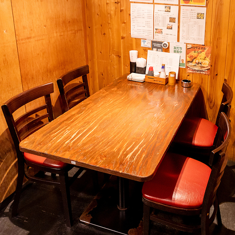 【4~6名様でご利用頂けるお席】友達グループでの集まりや、仕事帰りの仲間内、少人数グループでお使い頂きやすいテーブル席がございます。高さのある壁で仕切られてるので、落ち着いてお食事を楽しんで頂けます!