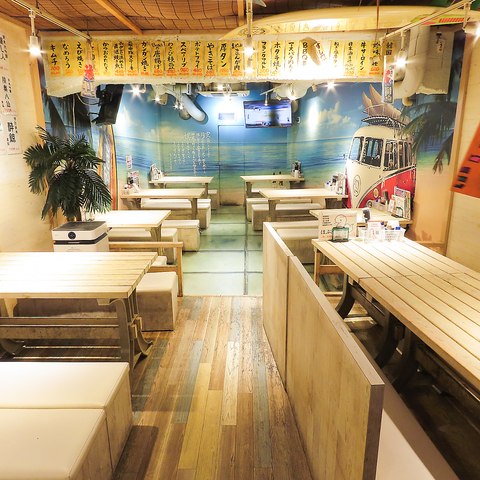 地下へ続く階段を降りた瞬間から常夏リゾートの空気に包まれる“都会の海の家”。西新宿とは思えない開放感あふれる空間で、ゆるさとワイワイ楽しめる賑やかさが共存しています。BBQの香りが漂い、海を囲む活気ある雰囲気はまるで旅行気分。友人同士の集まりから大人数の宴会まで心地よく過ごせる、特別な場所です。