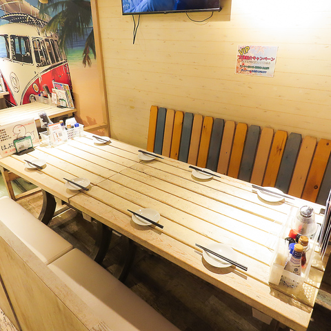 Soulmate Beachの個室は、8名から利用できるゆったり空間で、周りを気にせず楽しめるのが魅力。リゾート感あふれる店内の中でも特に落ち着いた雰囲気で、会社の飲み会や女子会にも最適です。広々とした設計で快適に過ごせるため、ゆっくり語りたい場面にもぴったり。特別感のある時間をお過ごしください。