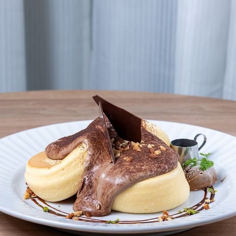 パンケーキの上にショコラ生クリームをたっぷり!ショコラソース、ショコラアイスでショコラ三昧!