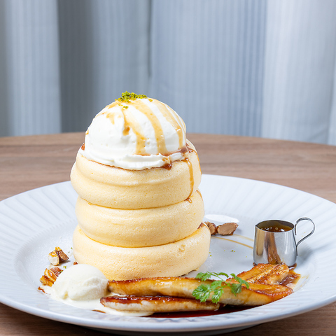 パンケーキの上には生クリームをトッピング!キャラメルソースをたっぷりかけてキャラメリゼしたバナナと一緒にお召し上がり下さい。