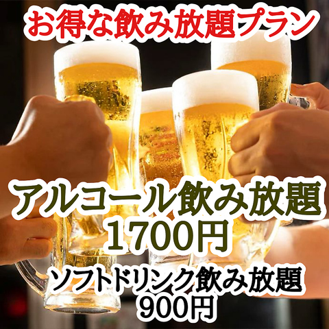 90分単品飲み放題!90分アルコール飲み放題1700円、ソフトドリンク900円でご用意しております!