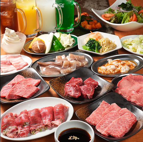 あかみうしの厳選されたお肉(7品)サラダおつまみ(3品)デザート(1品)のコースになります。厳選されたお肉をご堪能ください!また、+1890円(税込)で100分の飲み放題も可能です!宴会♪家族♪友人♪など是非ご利用ください!