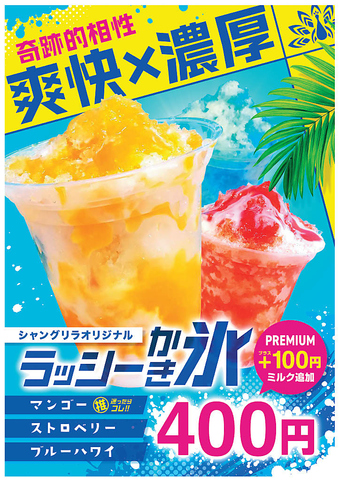 シャングリラでしか味わえないオリジナルラッシーかき氷!!マンゴー・ストロベリー・ブルーハワイ3種類展開してます。plus110円(税込)でミルク追加も可能!