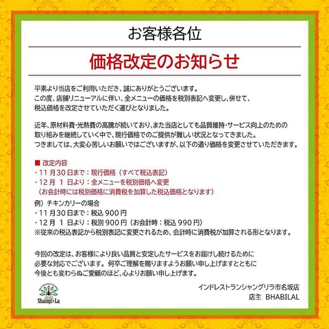 店舗リニューアルに伴い、全メニューの価格を税別表記へ変更し、併せて税込価格を改定させていただく運びとなりました。また、令和7年12月1日のリニューアルに伴い、店内では税別表記へ変更しておりますが、ホットペッパーグルメの掲載記事につきましては、システム上「税別表記」ができないため、税込表記でのご案内となっております。