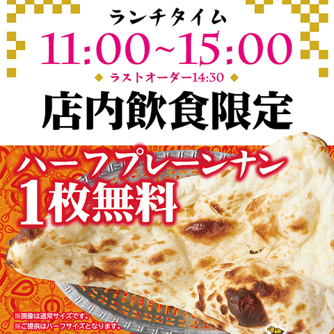 ランチタイム(11:00~15:00)店内飲食に限り、ハーフプレーンナンを無料もう1枚ご案内♪アツアツの焼き立てナンをおかわりして、心も体も大満足!