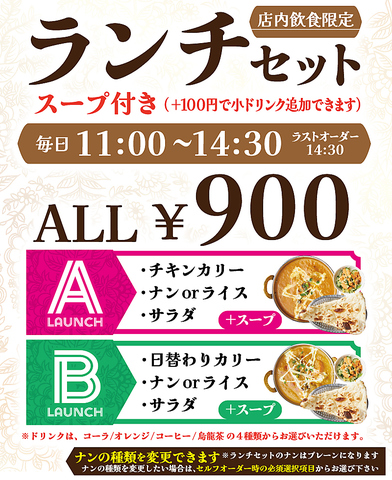 ランチセット(スープ付き)が900円♪大人気チキンカリーと日替わりカリー!12月1日価格改定あり。