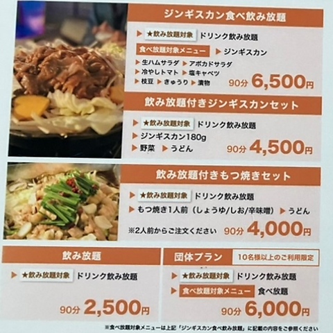 90分のジンギスカン食べ放題&ドリンク飲み放題は6,500円!いっぱい食べたい人にオススメのプランです!