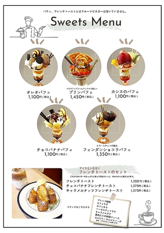 おやつとドリンクの内容はビュッフェ台の黒板か別紙をご覧ください。