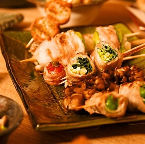 新鮮野菜を豚肉で巻き、炭火で香ばしく焼き上げた名物串。彩り鮮やかで女性にも大人気。