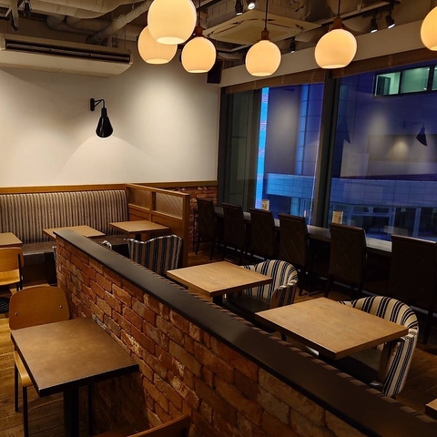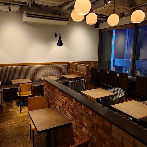 店内はレンガ調の壁や温かみのあるペンダントライトが配され、大人の隠れ家のような雰囲気。ゆったりしたテーブル席は、片側がソファタイプのため長時間でも快適にお過ごしいただけます◎仕事帰りのサク飲みや女子会など会話を楽しみたい夜に最適です。おしゃれなインテリアに囲まれて、料理とお酒をお楽しみください♪