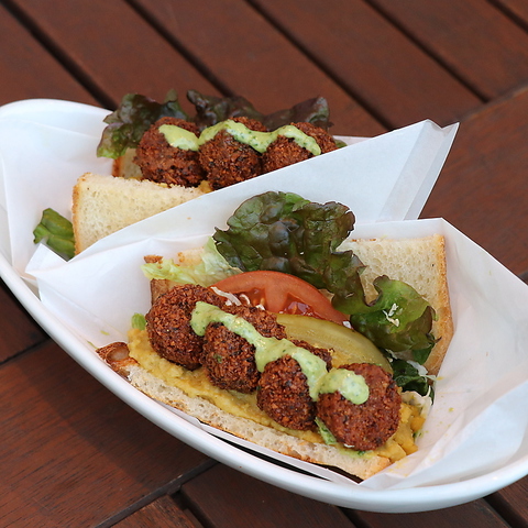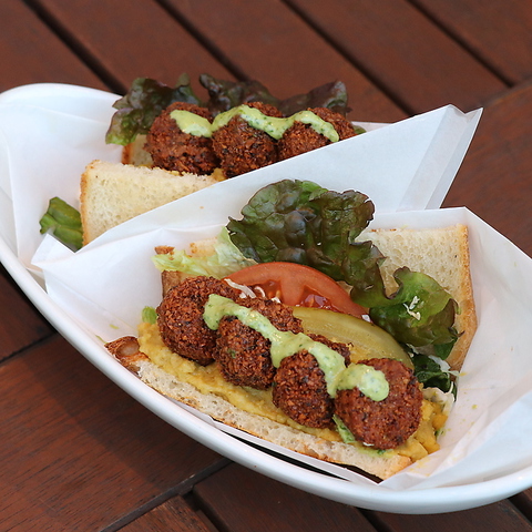 挽いたひよこ豆に数種類のスパイスやハーブを加え、カリッと揚げた中東のヘルシーなベジタリアンメニュー「ファラフェル」。創業当時からのこだわりレシピで、癖になる味です。外はカリッと中はモチッとした自家製パンでサンドしています。