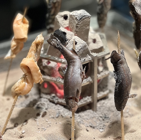各テーブルの炭で美味しく焼き上げていただく料理もございます。炭の燈火を見つめながらお酒をかたむけて。日常では味わえない時間をお楽しみください。
