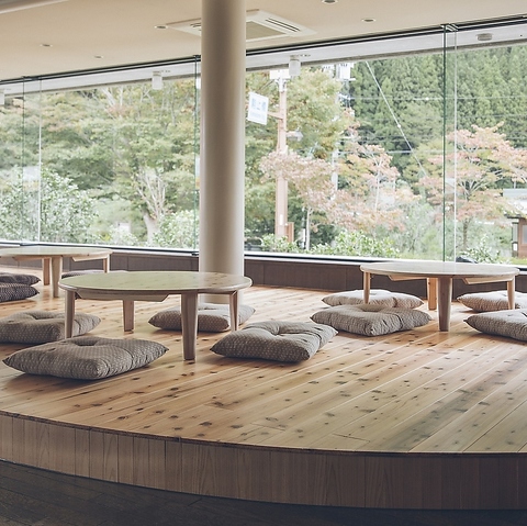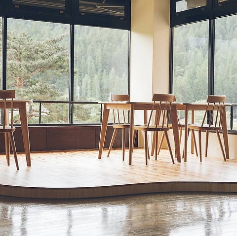 2人掛けテーブルが2つ、4人掛けテーブルが1~2ヶ所ございます。広々とした空間の中、四季折々の景色を眺めながらのお食事は、旅の疲れも癒されます。