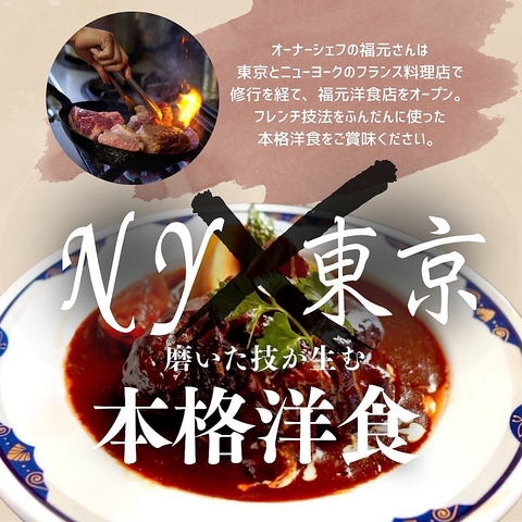 オーナーシェフ福元は、東京とニューヨークのフランス料理店で長年修行を積みました。その経験から生まれたのが、フレンチの繊細な技法をふんだんに取り入れた本格洋食です。伝統的な洋食の枠を超えた、洗練された深い味わいをご提供。シェフの情熱と技術が詰まった至高のメニューを、心ゆくまでご賞味ください。