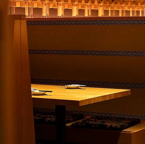 【ボックス席】半個室風のテーブル席です。デートにおすすめで2名様に人気のお席となっております。間接照明灯る大人な空間で、素材にこだわった和食と日本酒をお楽しみください。