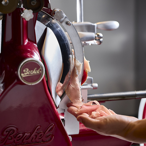 ベルケル社フライホイール式スライサーを使用した、極上な生ハムスライス。