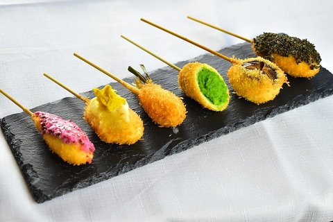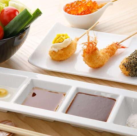 地元愛知県産の新鮮な野菜をはじめ、上質な和牛やもち豚、旬の魚介類などを使用しております。それぞれの素材の持ち味を最大限に引き出すため、衣は極限まで薄く仕上げ、サクッと軽やかな食感に。揚げたての串は素材の旨みが引き立ち、ひと口ごとに贅沢な味わいが広がります。見た目も美しく、身体にもやさしい逸品をぜひご堪能ください。