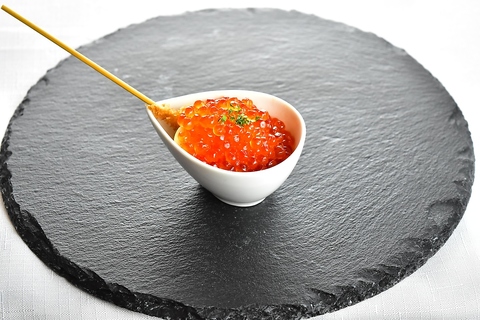 刺身でも味わえるほど新鮮で脂ののったサーモンをサクッと香ばしく串揚げにし、その上に北海道産のぷちぷち弾ける国産いくらをたっぷりと贅沢にトッピング。とろけるサーモンの旨みと、いくらの濃厚なコクが絶妙に絡み合い、まさに至福の味わい。塩でさっぱり、ソースで濃厚にと、お好みの味付けでどうぞ。