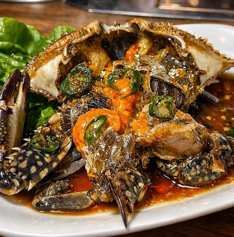 北海道産の卵がいっぱい入った新鮮ワタリガニを韓国しょうゆ漬けした韓国料理です。宮崎で食べられるのが珍しい料理です。韓国ではご飯どろぼうと言われる料理で締めにご飯とのりを甲羅の中に入れ、カニ味噌と残った醤油を混ぜて食べて下さい。