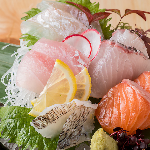 系列のお鮨屋さんの「ながり鮨」と同じ魚屋さんが卸してくれる季節ごとの旬の魚を贅沢に盛り合わせ!!5種盛り合わせがとてもリーズナブル!!コスパ◎です!!是非お召し上がりください!!「