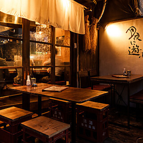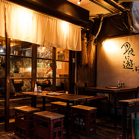 月夜に遊ぶ。とは、どこか懐かしい雰囲気の中で日本酒と藁焼きが楽しめます!迫力満点の炎に包まれ、旨味が凝縮された藁焼きは自慢の1品!この店でしか味わえない絶品の藁焼きをぜひ!きっとあなたも「藁焼き酒場 月夜に遊ぶ。」の常連の一人に!