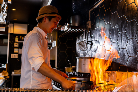 高知県の伝統調理法束ねた藁に火を付け、大きく燃え上がった炎で食材の表面を炙ります。高温で一気に焼き上げるので食材の表面だけを一瞬で焼くことができ食材の旨味をギュッと閉じ込めます。「藁焼き酒場 月夜に遊ぶ。」では更に桜のチップで燻すことで独特の香りを纏わせています。
