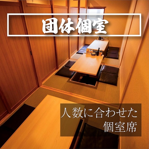【完全個室|2名~15名】2名様から受付OKの完全個室のお席をご用意しております。また、人数に合わせて最大15名様まで個室でご案内可能です!掘りごたつ個室なので周りを気にせず足を伸ばしてお寛ぎいただけます♪◎落ち着いた空間の完全個室なので周りを気にぜずゆったり出来ます!個室は人気の為ご予約がおすすめ◎