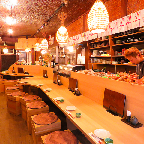 【1階には気軽に座れるカウンター席】横に並んでゆったり語り合えるカウンター席はおひとりでしっぽり飲むのもよし、デートや仕事帰りに職場の仲間とのサク飲みにもピッタリなお席です!当店自慢の逸品を心ゆくまでご堪能ください。