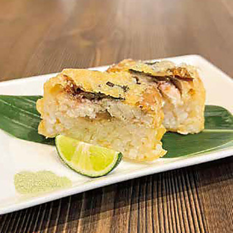 追加/1貫 275円 … 鯖や自慢のさば寿司を天ぷらにしちゃったよ!バルサミコと塩でいただく新感覚さば寿司