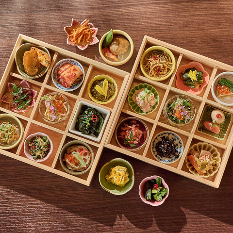 月替わりのメイン料理やデザートまでついた平日限定のハーフブッフェをご用意しました。ごはんがすすむ約30種のごはんのお供やおかず、“ごはんどろぼう”を色鮮やかな豆皿に盛り付けてお召し上がりいただける見た目も楽しいブッフェです。岐阜県産食材をたっぷりと味わうブッフェで、ランチタイムをごゆっくりとお過ごしください。