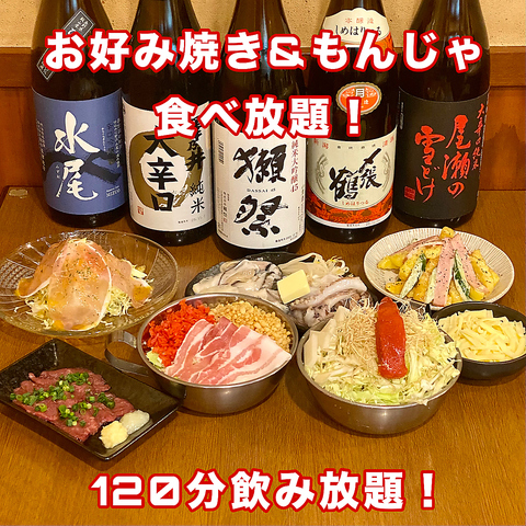 榊の定番メニューをお楽しみ頂けるコースです。お好きなお好み焼き・もんじゃ食べ放題。120分飲み放題付き