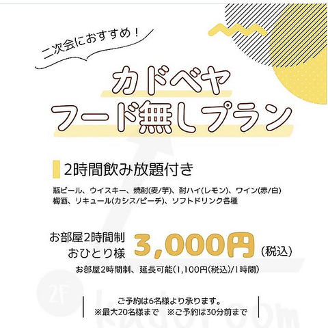 2階の完全個室空間【カドベヤ】フード無しプラン2時間飲み放題