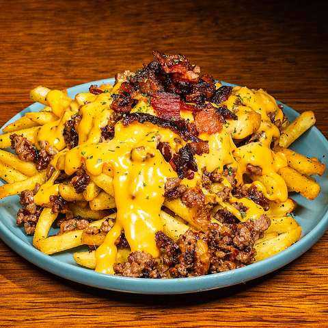パンクスタイルはハンバーガーに入っている物バンズ代わりにを熱々フライドポテトの上に乗せたオリジナル料理です。シェアにおすすめです!厳選した100%牛肉格部位シングルパティ、シングルチェダーチーズ、スライスオニオン、ハウスソース、フライドポテト、ベーコントッピング。