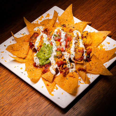 アメリカで人気なTEX MEX料理、シェアにおすすめ。牛肉100%ミンチを使用した1年掛けて開発したオリジナルチリレシピにサルサ、グアカモーレ、サワークリームソース、ハラペーニョ、チェダーチーズ、当店で揚げてるコーントルティーヤ。