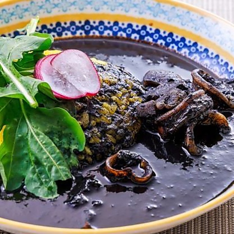 イカの旨味がたっぷりと溶け出したいか墨煮に、魚介の風味豊かなサフランリゾットを合わせました◎口いっぱいに広がる海の幸の香りと、濃厚な味わいが楽しめます♪価格は1400円(税込)です。