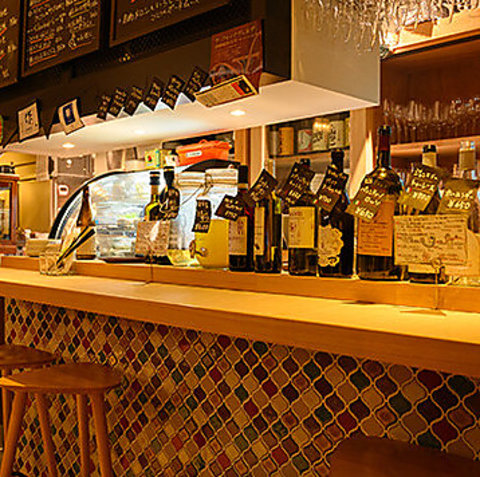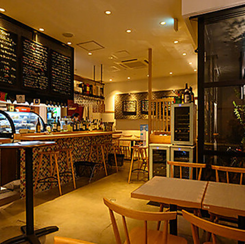 モザイク調のタイルがおしゃれに彩る店内は、暖色系の灯りに優しく照らされ、居心地の良い癒やし空間となっております。つい時間を忘れてしまうほど、ゆったりとお寛ぎいただけるテーブル席に加え、気軽にサクッと飲みたい時におすすめのスタンディングスペースもご用意。日頃の疲れを癒やしに、ぜひお気軽にお立ち寄りください。