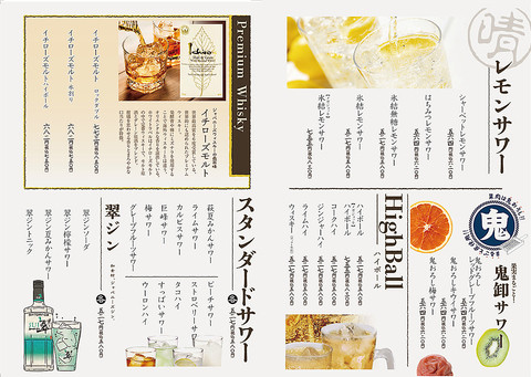 | ハイボール | ウィスキー(ロック・水割り・ストレート)/ラッキーハイボール/ジンジャーハイボール/グレープフルーツハイボールライムハイボール/ソルティライチハイボール/モンスターハイボール |