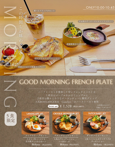 GOOD MORNING FRENCH PLATE以外にも、モーニングセットを3種ご用意◎大きな1枚ベーコンと目玉焼きとふわふわパンの「ランドスケープセット」、人気のハム&チーズ「クロックムッシュセット」、1枚ベーコンとポテトサラダの「ダッチベイビーセット」は950円(税込)です。 10:00~10:45のこの時間しか味わえないお料理をぜひ!