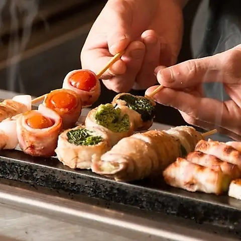 炭火で焼き上げる名物「野菜巻き」を思う存分楽しめる“無限食べ放題コース”。新鮮野菜を豚肉で巻いた看板メニューを中心に、全20種が食べ放題。さらに唐揚げやサラダなど酒場の人気メニューも揃い、飽きずに最後まで楽しめる充実の内容に。生ビール付き2.5時間飲み放題で4,500円とコストパフォーマンスも抜群。