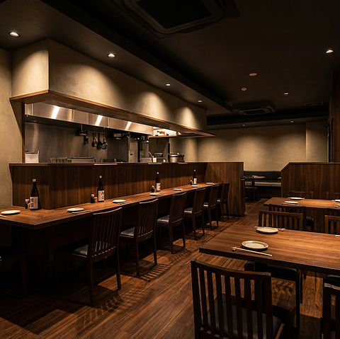 【カウンター席】落ち着いた雰囲気の中でゆったりとお食事を楽しめるカウンター席もご用意しております。おひとり様はもちろん、距離が縮まるデート利用にもぴったり♪スタッフとの会話や調理の様子を楽しみながら、特別な時間をお過ごしいただけます。温かみのある空間で、心地よいひとときをお楽しみください。