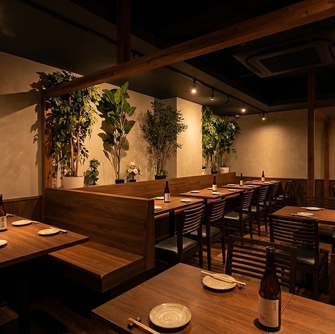 木彫で統一されたモダンな雰囲気の中に緑もあって落ち着ける環境の雰囲気。少人数様から団体様まで幅広くご利用いただけます!