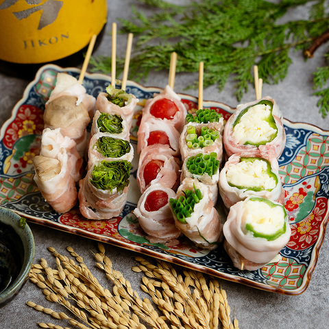 新鮮な旬野菜を薄切りの豚肉で丁寧に巻き上げ、炭火で香ばしく焼き上げた当店自慢の「野菜巻き串」。シャキシャキ食感の野菜とジューシーな肉の旨みが重なり合い、見た目も彩り鮮やか。ヘルシーで食べやすく、女性にも人気の一品です。