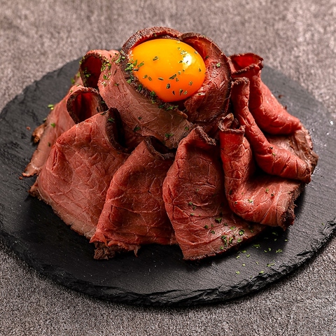 見栄え満点、しっとりと仕上げた自家製のローストビーフのタワー!濃厚ウニソースと卵黄を絡めて召し上がれ◎