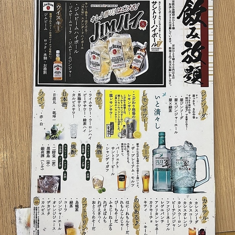 | サワー | ライムサワー・ピーチサワー・男梅サワー・ウーロンハイ・緑茶ハイ・カルピスサワー・デカビタサワー・ |