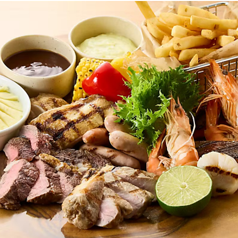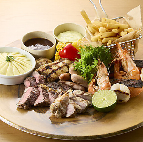 オージービーフ100g、みかわ豚100g、チキンモモ肉100g、エビ2本、サーモン2カット、ホタテ2個、サイドディッシュ2種類チョイス、ソース2種類チョイス